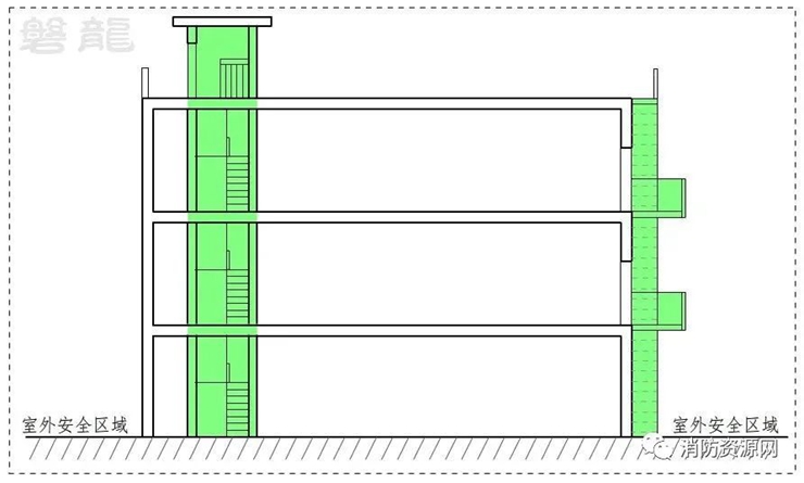 需要说明的是,对于设置在建筑外墙上的室外疏散楼梯,虽然处于室外区域,但受制于建筑结构及外墙的耐火极限影响,仍属于室内安全区域。(图示3)
